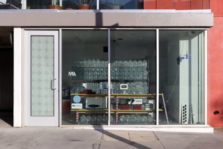 M_A Storefront hosts Why Not Things?, a new installation by Jesse Hammer that presents a visual inventory of the testimonials, material objects, and numbers that have emerged around the mutual aid initiative Heat Aid. A collection of things and graphics lend themselves to a stylized portrayal of energy, water, and talismans of refuge. The project simultaneously offers itself as a storage space for donated water units, and presents a visual accounting of the unfolding crisis of shade and water inequity. Somewhere between an Enzo Mari puzzle, a fashion storefront display, and an IRL infographic, the installation amplifies the literal container of the Storefront to extend itself to something that is thick with an attitude about the issues at play. Re-imaging the crisis through the ethos of mutual aid, Hammer’s project evokes how the sharing of things, alongside language and information, become tokens of love for a community in need.